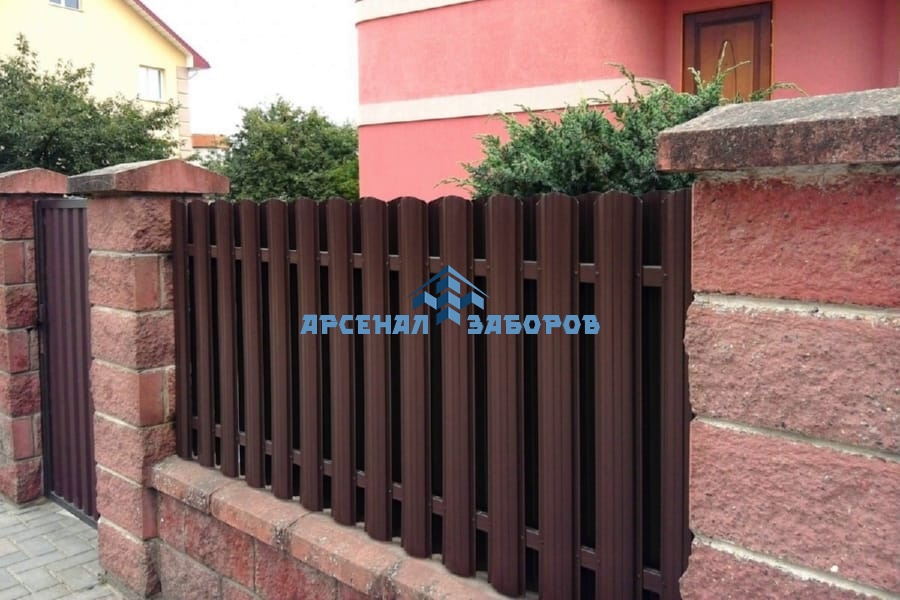 Забор из евроштакетника с кирпичными столбами