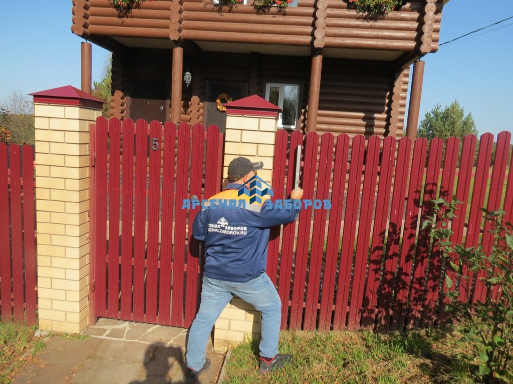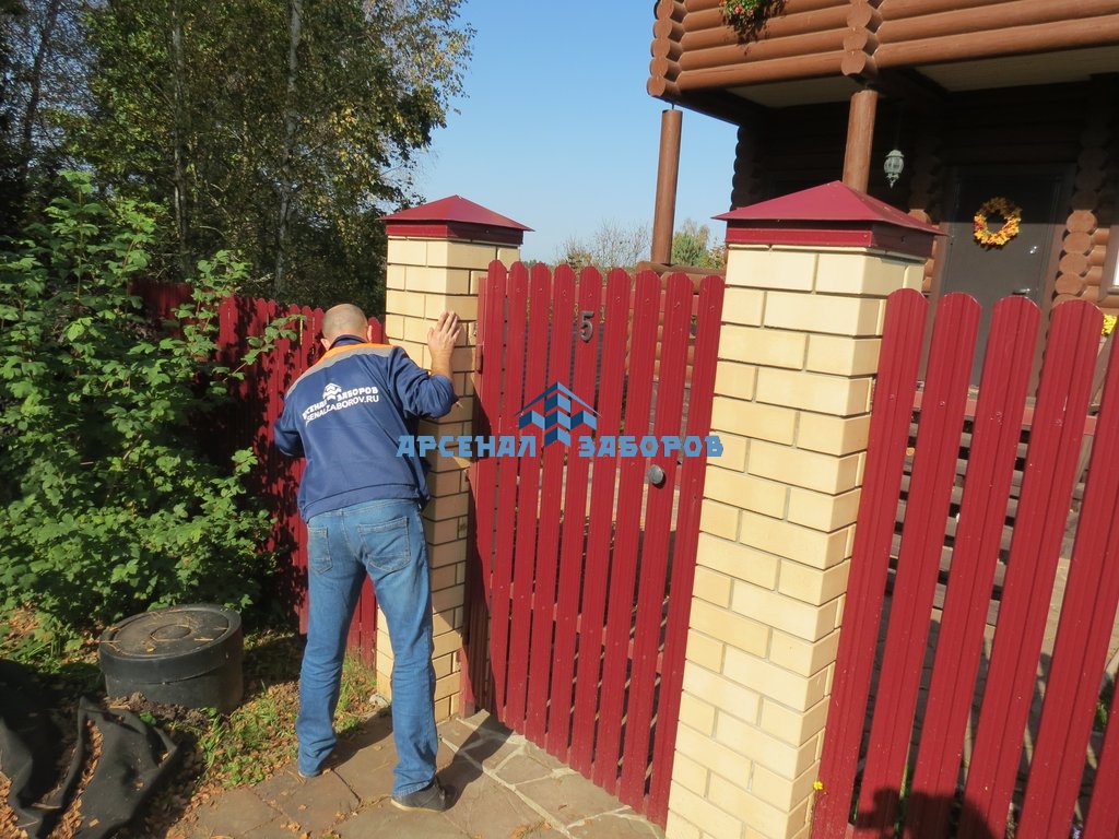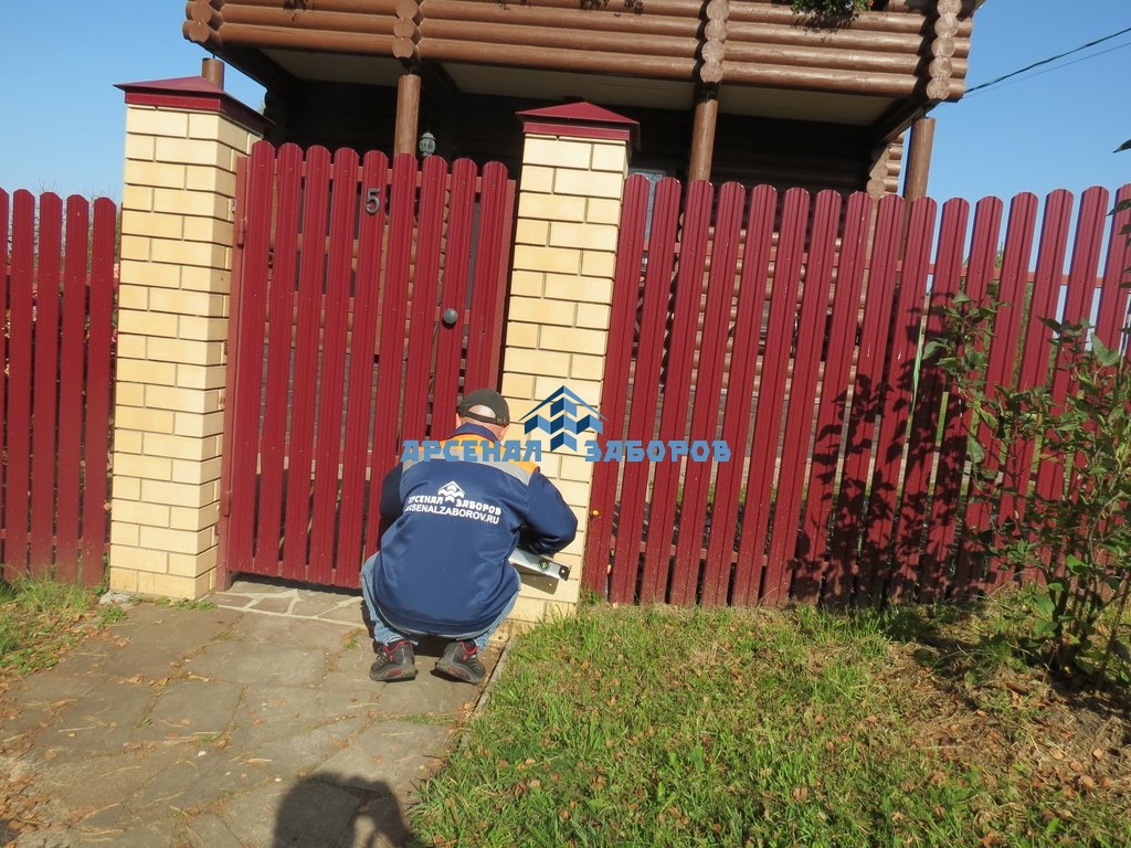 Забор из евроштакетника с кирпичными столбами