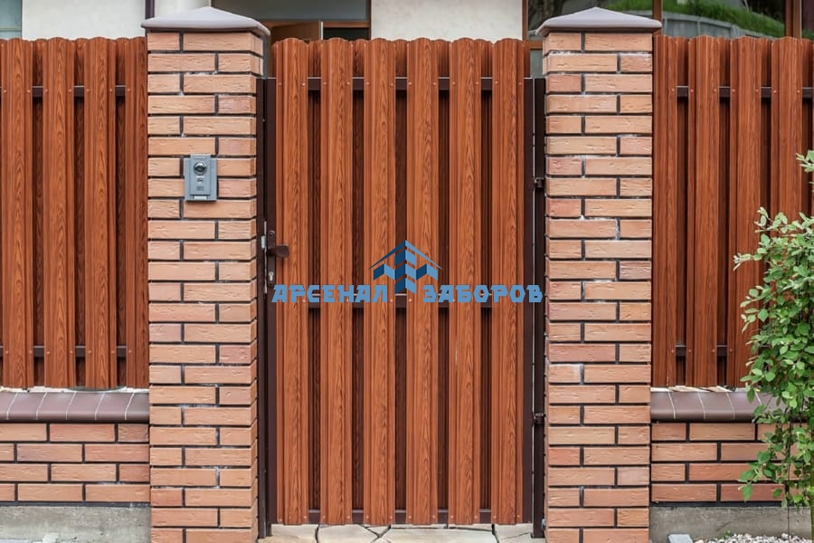 Забор из евроштакетника с кирпичными столбами