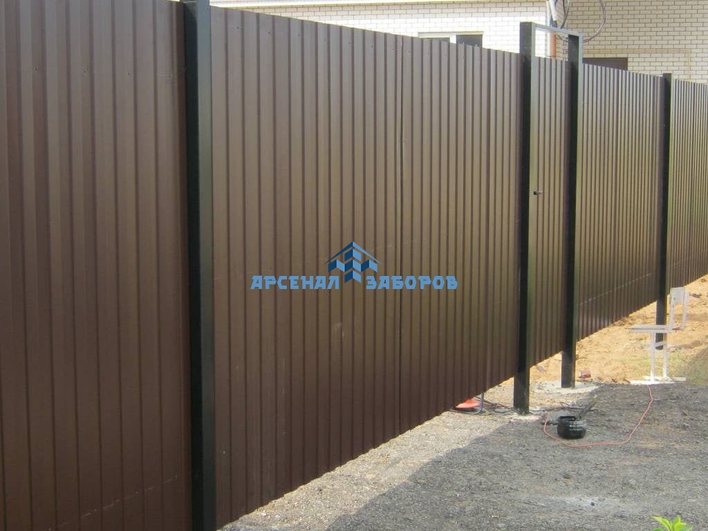 Конструкция забора из профлиста на ленточном фундаменте и с кирпичными столбами